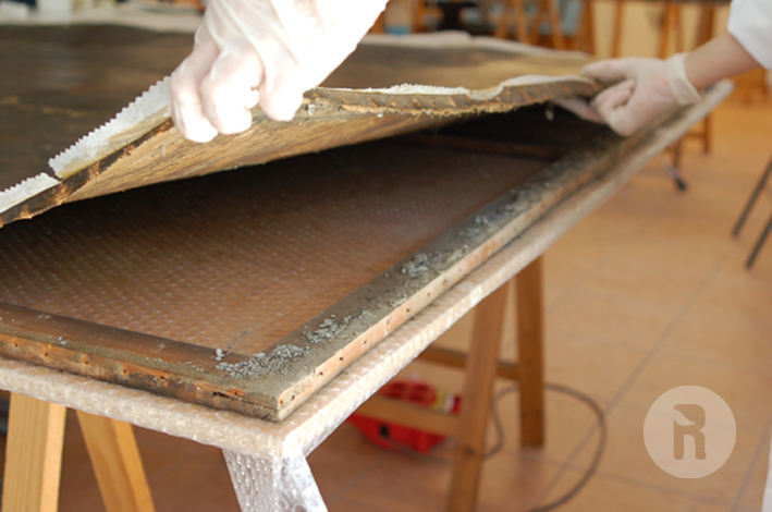 S’han eliminat tots els elements afegits al suport, ja siguin pegats, coles i estucs. S’han reintegrat els forats, estrips i la costura oberta de la tela mitjançant empelts, ponts de fil i soldadura, segons el cas. S’ha reforçat la costura amb una retícula de fil aplicada al revers. S’ha substituït el bastidor per un de fusta i alumini tipus flotant. Després d’una delicada neteja, es pot gaudir de l’estil inconfusible d’Antoni Viladomat, amb l’elegància del marc amb la policromia original recuperada. Col·laboració: Ingrid Forell