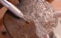 Hostier de pinça cobert completament per una capa uniforme d’òxid de ferro. La textura d’aquest metall s’havia transformat en una superfície rugosa i picada. Els gravats en baix relleu que decoraven l’interior de les pales, estaven parcialment perduts pràcticament de forma irreversible, degut a aquesta alteració físico-química del suport.