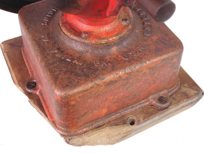Molí de cafè embolcallat per una capa incrustada d’òxid de ferro que havia travessat la pintura vermella fins fer-la saltar en varies zones. El calaix de fusta havia perdut part dels seus llistons. Mancava algun element estructural com una de les rodes laterals. La pols i la brutícia adherides al suport, contribuïen a augmentar l’aspecte brut i ruïnós de l’objecte.